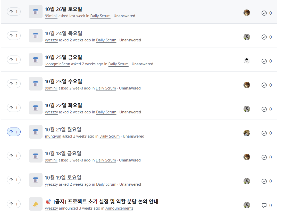 매일 오전 11시에 데일리 스크럼 회의를 진행하며 각자의 진행 사항 및 이슈를 공유했습니다. 또한, 회의록을 작성하여 Github Discussion에 업로드하여 회의내용을 다시 확인할 수 있게 했습니다.