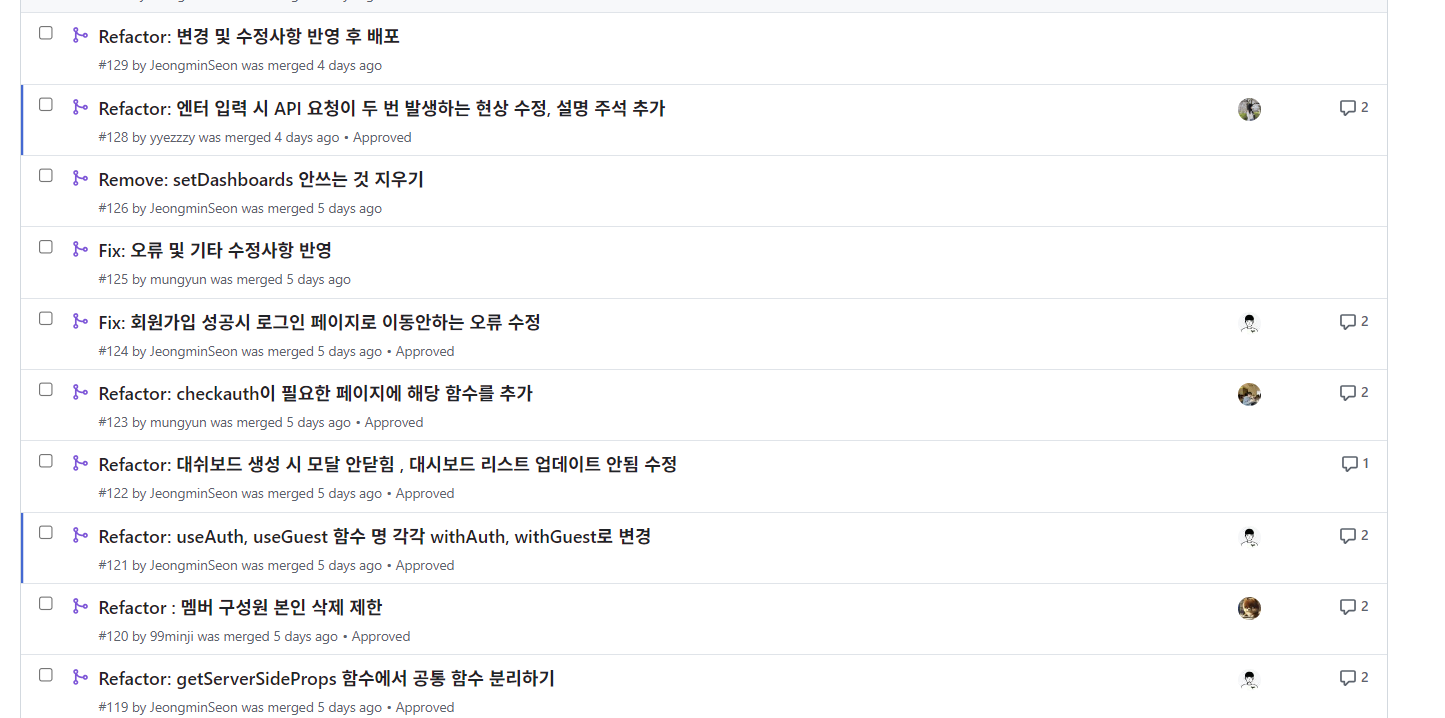 또한, 하나의 이슈에 하나의 브랜치를 만들어 작업을 수행했기 때문에 작업의 진행 속도가 빨랐고 Confilct도 많이 발생하지 않았습니다.